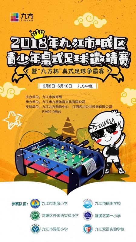 2018九江市城區(qū)青少年桌式足球邀請(qǐng)賽——暨“九方杯”桌式足球爭(zhēng)霸賽,8日起開賽! -
